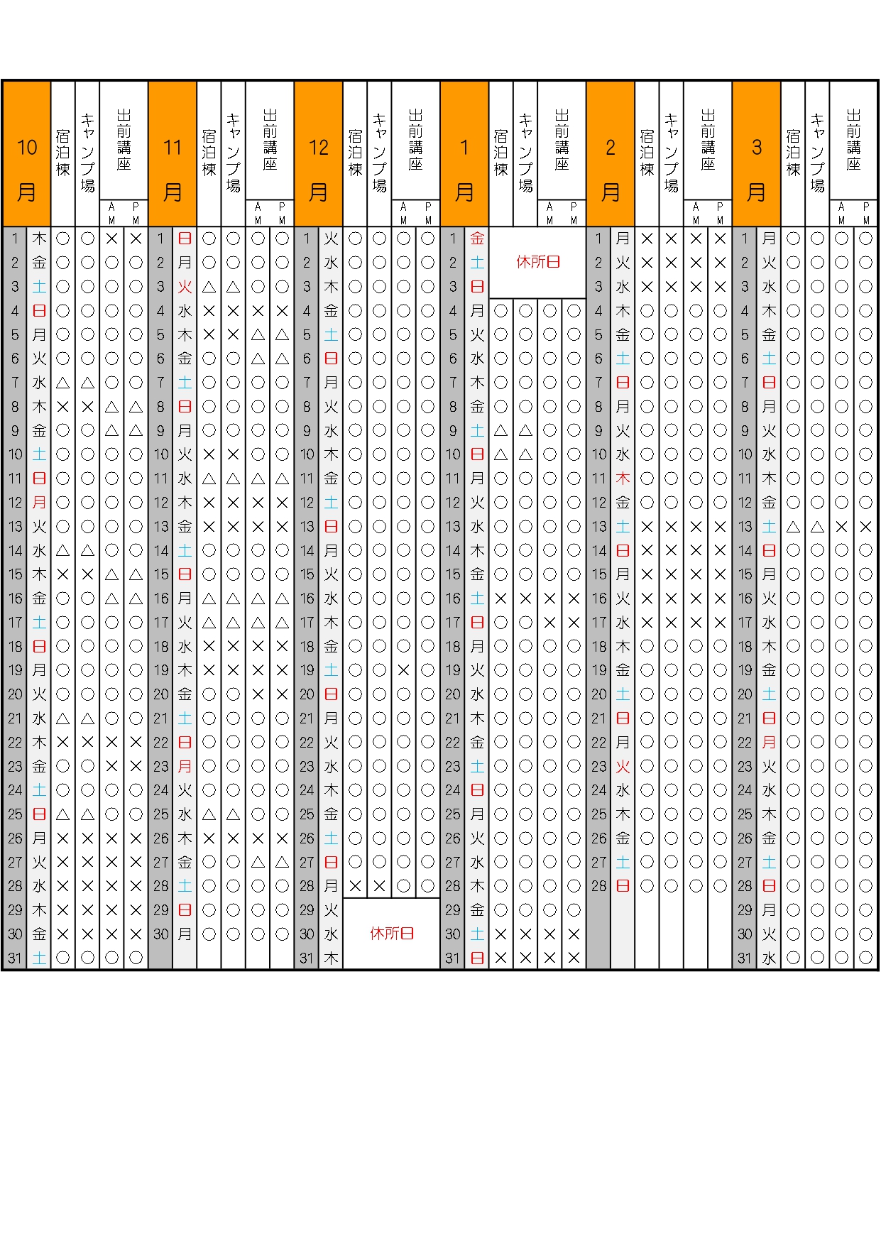 令和8年1月28日現在の空き室状況です。最新の情報につきましては、電話にてご確認ください。 ※ご予約は、ご利用1ヶ月前までにお電話でお願いたします。 ○:受け入れ余裕があります △:電話でご相談ください ☓:空きがありません